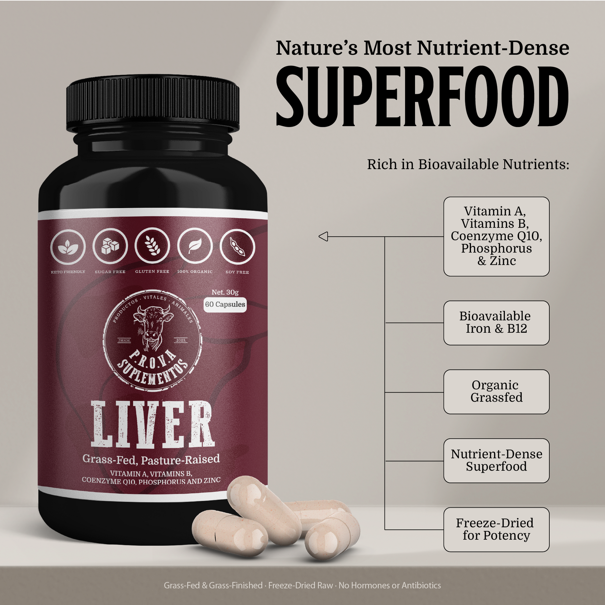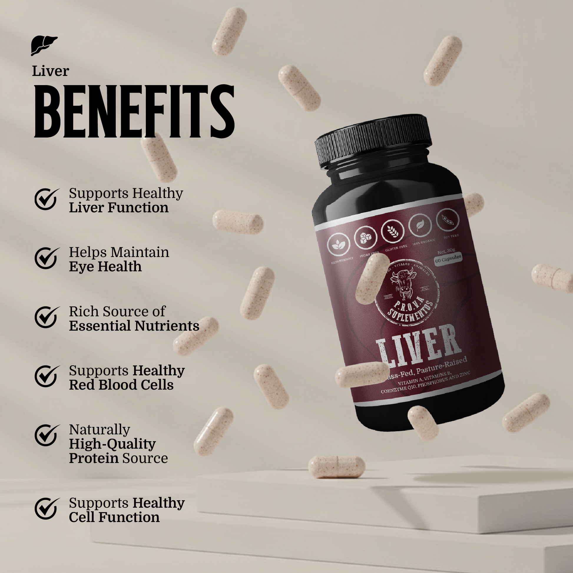 Suplemento de hígado 100% de animales criados en pastizales naturales, deshidratado a baja temperatura para conservar sus nutrientes esenciales. Diseñado para potenciar tu energía vital, salud sanguínea y detoxificación natural. Ideal para fortalecer tus defensas, regenerar células y equilibrar tu metabolismo